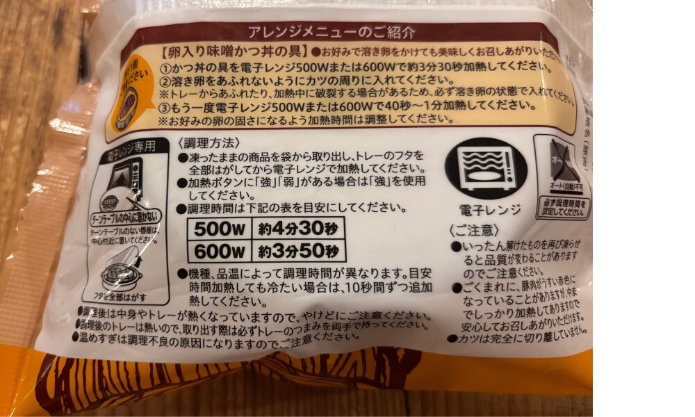 | 調理時間 | レンジで4分50秒(500W) |