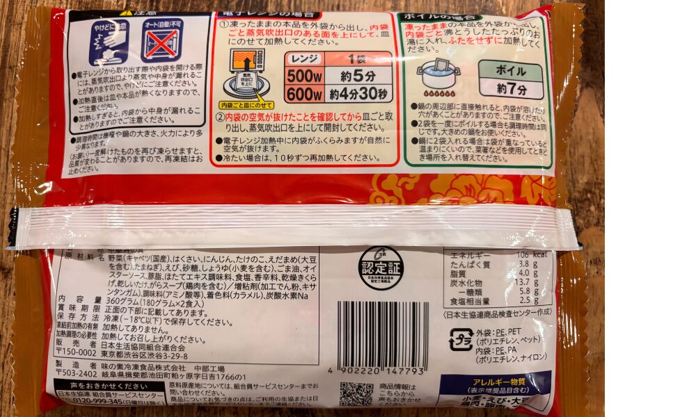 | 調理時間 | レンジで5分(500W) ボイルで7分 |